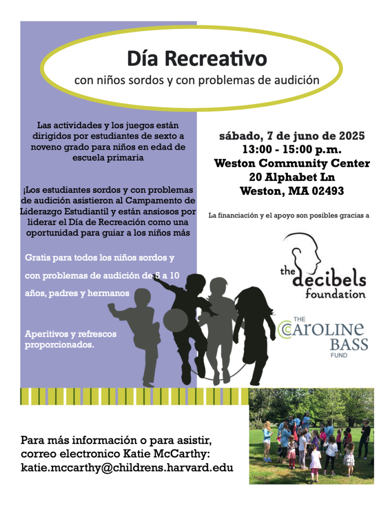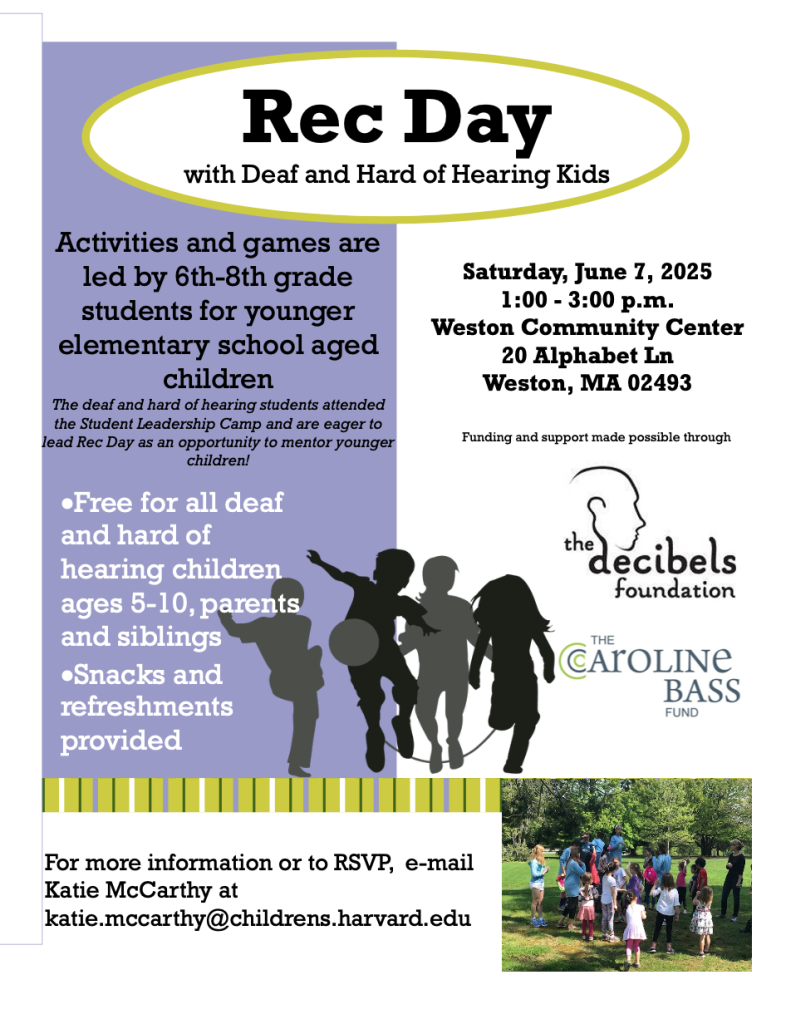 Is your deaf or hard of hearing child between ages 5-10? Following the Success Leadership Camp, the middle school campers will host a fun Recreational Day on Saturday, June 7 for children ages 5-10, at the Weston Community Center in Weston, MA on Saturday June 7, 1-3pm. D/HH middle school students who attended the Success Leadership Camp in Vermont in April will coordinate games for younger children such as Dragon Tail and Red Light & Green Light. They are very much looking forward to this day, and we hope you can join us! Siblings are welcome.